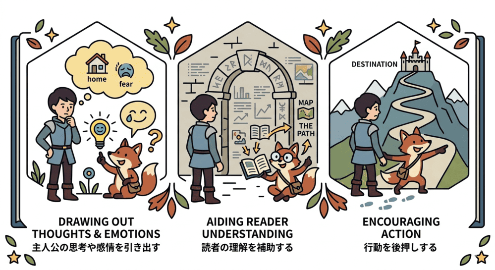 主人公の内面を引き出したり、読者の気持ちを代弁したり、物語が進むきっかけを作ってくれます。